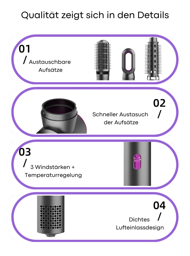 Durch diese Kombination aus fortschrittlichen Technologien und flexiblen Temperatureinstellungen wird das Risiko von Hitzeschäden deutlich reduziert, und das Haar bleibt gesund und glänzend.